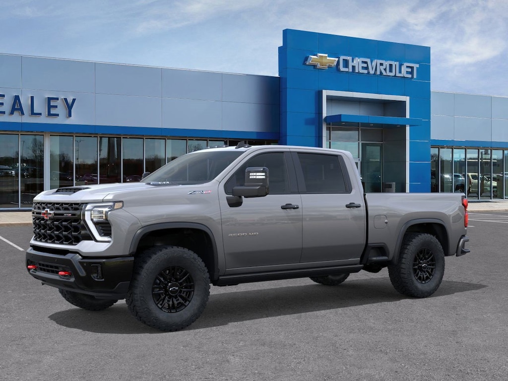 Sterling Gray Metallic 2026 Chevrolet Silverado 2500HD ZR2 4WD 10-Speed Automatic 6.6L V8 10-Way Power Driver Seat Adjuster w/Lumbar, 10-Way Power Passenger Seat Adjuster w/Lumbar, 120-Volt Bed Mounted Power Outlet, 120-Volt Interior Power Outlet, 15 Diagonal Multicolor Head-Up Display, 170 Amp Alternator, 3.73 Rear Axle Ratio, 4-Wheel Disc Brakes, 5th Wheel & Gooseneck Trailer Wiring Provisions, 7 Speakers, 720 Cold-Cranking Amps Heavy-Duty Battery, ABS brakes, Air Conditioning, All-Weather Floor Liners (LPO), Alloy wheels, AM/FM radio: SiriusXM with 360L, Apple CarPlay/Android Auto, Auto High-beam Headlights, Auto-dimming door mirrors, Auto-dimming Rear-View mirror, Automatic temperature control, Bed View Camera w/2 Trailer Camera Provisions, Black Chevytec Spray-On Bedliner, Bluetooth® For Phone, BOSE Premium 7-Speaker Sound System, Brake assist, Bumpers: chrome, Chevrolet Connected Access Capable, Color-Keyed Carpeting Floor Covering, Compass, Deep-Tinted Glass, Delay-off headlights, Driver door bin, Driver Memory, Driver vanity mirror, Dual front impact airbags, Dual front side impact airbags, Durabed Pickup Bed, Electric Rear-Window Defogger, Electronic Stability Control, Emergency communication system: OnStar, EZ Lift Power Lock & Release Tailgate, Floor-Mounted Center Console, Front anti-roll bar, Front Bucket Seats, Front Center Armrest, Front dual zone A/C, Front fog lights, Front LED Fog Lamps, Front Rain-Sensing Wipers, Front reading lights, Front wheel independent suspension, Fully automatic headlights, Garage door transmitter, Heads-Up Display, Heated 2nd Row Outboard Seats, Heated door mirrors, Heated Driver & Front Outboard Passenger Seating, Heated front seats, Heated rear seats, Heated Steering Wheel, Heated steering wheel, High Gloss Black Mirror Caps, Hitch Guidance w/Hitch View, Illuminated entry, In-Vehicle Trailering App System, Keyless Open & Start, LED Cargo Area Lighting, LED Smoked Amber Roof Marker Lamps, Low tire pressure warning, Manual Tilt & Telescoping Steering Column, Memory seat, Mobile Service Plus, Multi-Flex Tailgate, Occupant sensing airbag, OnStar Services Capable, Outside temperature display, Overhead airbag, Overhead console, Panic alarm, Passenger door bin, Passenger vanity mirror, Perforated Leather Seat Trim, Power Door Locks, Power door mirrors, Power driver seat, Power Front Windows w/Driver Express Up/Down, Power Front Windows w/Passenger Express Up/Down, Power passenger seat, Power Rear Windows w/Express Down, Power Sliding Rear Window w/Defogger, Power steering, Power Sunroof, Power windows, Power-Retractable Black Assist Steps, Premium audio system: Chevrolet Infotainment 3 Premium, Push Button Start, Radio: Chevrolet Infotainment 3 Premium System, Rain sensing wipers, Rear Camera Mirror, Rear Cross Traffic Alert, Rear reading lights, Rear seat center armrest, Rear step bumper, Rear Wheelhouse Liners, Rear window defroster, Remote keyless entry, Remote Vehicle Starter System, Security system, SiriusXM w/360L Trial Subscription, Speed control, Speed-sensing steering, Split folding rear seat, Steering Wheel Audio Controls, Steering wheel mounted audio controls, Tachometer, Technology Package, Telescoping steering wheel, Tilt steering wheel, Traction control, Trailer Camera Provisions, Trip computer, Turn signal indicator mirrors, Ultrasonic Front & Rear Park Assist, Unauthorized Entry Theft-Deterrent System, Universal Home Remote, Up-Level Rear Seat w/Storage Package, Variably intermittent wipers, Ventilated Driver & Front Passenger Seats, Ventilated front seats, Voltmeter, Wheels: 18 Gloss Black w/Etched ZR2 Logo, Wi-Fi Hotspot Capable, Wireless Charging, Wireless Phone Projection, Wrapped Steering Wheel, ZR2 Suspension Package.