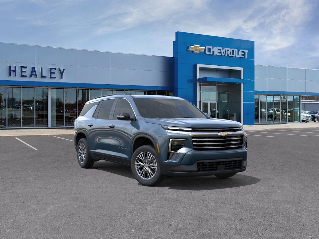 Lakeshore Blue Metallic 2026 Chevrolet Traverse LT 2LT AWD 8-Speed Automatic 2.5L DOHC 3rd row seats: split-bench, 4-Way Manual Front Passenger Seat Adjuster, 4-Wheel Disc Brakes, 6 Speakers, 6-Speaker Audio System Feature, 8-Passenger Seating (2-3-3 Seating Configuration), 8-Way Power Driver Seat Adjuster, ABS brakes, Air Conditioning, Alloy wheels, AM/FM radio: SiriusXM with 360L, Apple CarPlay/Android Auto, Auto High-beam Headlights, Automatic temperature control, Brake assist, Bumpers: body-color, Child-Seat-Sensing Airbag, Compass, Delay-off headlights, Driver door bin, Driver vanity mirror, Dual front impact airbags, Dual front side impact airbags, Electronic Stability Control, Emergency communication system: OnStar, Four wheel independent suspension, Front anti-roll bar, Front Bucket Seats, Front Center Armrest, Front dual zone A/C, Front reading lights, Fully automatic headlights, Heated door mirrors, Heated Driver and Front Passenger Seats, Heated front seats, Heated steering wheel, Illuminated entry, Low tire pressure warning, Mobile Service Plus, Navigation System, Occupant sensing airbag, Outside temperature display, Overhead airbag, Overhead console, Panic alarm, Passenger door bin, Passenger vanity mirror, Power door mirrors, Power driver seat, Power Liftgate, Power steering, Power windows, Preferred Equipment Group 2LT, Premium Cloth Seat Trim, Radio data system, Radio: : Audio System w/17.7 Diagonal Display, Rear air conditioning, Rear anti-roll bar, Rear reading lights, Rear window defroster, Rear window wiper, Remote keyless entry, Security system, SiriusXM with 360L Trial Subscription, Speed control, Speed-sensing steering, Spoiler, Steering wheel mounted audio controls, Tachometer, Telescoping steering wheel, Tilt steering wheel, Traction control, Trip computer, Turn signal indicator mirrors, Variably intermittent wipers, Voltmeter, Wheels: 18 Grazen Metallic Machined-Face Aluminum.